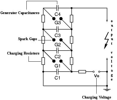 A definite advantage that the Marx circuit has over other impulse generating circuits is that very high impulse voltages can be generated using components rated for relatively low voltages. Impulses of different front times can be conveniently obtained by varying series resistor. The sphere-gap can be triggered at a predetermined voltage by adjusting the spacing between the spark gaps. Hence, it acts as a controlled switch. The steepness of the impulse voltage generated is affected by the inherent inductance of the Marx generator. This inductance is due to the charging loop comprising of the generator capacitor, front resistor and load capacitor. This cannot be reduced below a certain minimum value because of the restrictions placed on the minimum dimensions due to the high voltage ratings involved in the circuit.