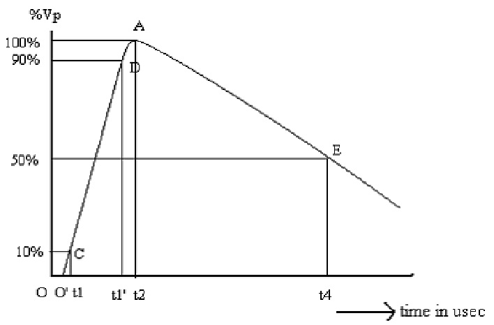 The impulse waves are specified by defining their rise or front time, fall (or tail time) to 50% peak value, and the value of the peak voltage. Thus 1.2/50µs, 1000 kV wave represents an impulse voltage wave with a front time of 1.2µs, fall (or tail) time to 50% peak value of 50µs and a peak value of 1000 kV. When impulse wave-shapes are recorded, the initial portion of the wave may not be clearly defined or sometimes may be missing. Hence, front and tail times are to be redefined. Referring to the wave shape in figure 1, the peak value A is fixed and referred to as 100% value. The point corresponding to 10% and 90% of the peak values are located on the front portion (points C and D).O' is taken as the virtual origin. 1.25 times the interval between times t1 and t2 corresponding to points C and D is defined as the front time, i.e. 1.25(O't1-O't2). The point E is located on the wave tail corresponding to 50% of the peak value, and it is t4. O't4 is defined as fall or tail time. In case, C is not clear or missing from the wave shape record, the point corresponding to 30% of the peak value is taken on the time axis and then the wave front time in that case will be 1.67 times in place of 1.25. The tolerances that can be allowed on the front and tail times are respectively ± 30% and ± 20%.The tolerance allowed on the peak value is ± 3%.